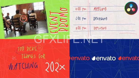 Bring a touch of creativity to your next project with the Event Promo template. Featuring animated scenes in a sketchy doodle style, this template includes colorful scenes designed as notes lists with your media and logos. Each scene is easily customizable with handy controllers and placeholders. Perfect for event promotions, slideshows, creative presentations and more.
