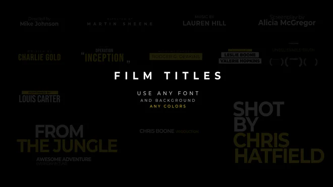 Film Titles is a powerful After Effects template that you can use to make a title sequence for your videos. It contains 24 text animations. Simply style them to match your own brand, using the intelligent color controllers. You can use them in your TV shows, commercials, films, movies, trailers and teaser videos. Impress your audience with this neat and dynamically animated AE template. Avialable in 4K.