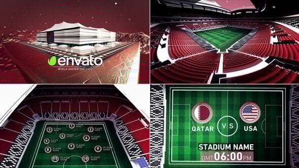 World Soccer Qatar 2022 Al Bayt Stadium Contains opener and team lineup and team challenge perfectly for TV as opener , sport videos, and more! You can Change 11 soccer player. Very simple and well organize project. Changing text, audio and hit render. Players and team play plan can be changed